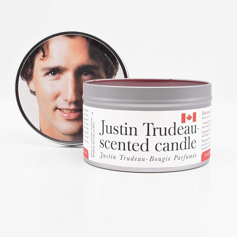 The 16 oz tin container bears Trudeau’s beaming face on the lid, perfect if you have always wanted to kiss a slightly miniaturized version of Justin Trudeau (or if you have always wanted to kiss a candle lid) It makes a great gift for anyone who is attracted to men, or Canadians, or both.