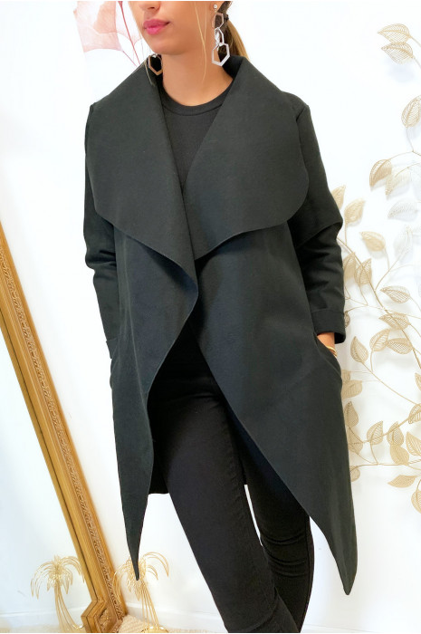 Veste 3 4 En Noir Avec Grand Col Tombant Poches Et Ceinture