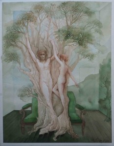 Grande Et Belle Aquarelle Symboliste Homme Femme Nue Arbre Signee Ebay