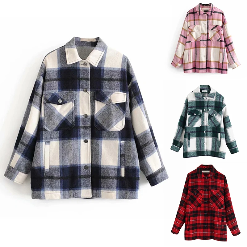 Plaid Surchemise Laine Melangee Veste A Carreaux Revers Col A Manches Longues Manteau Femmes Surdimensionnees Poches Avec Rabats Bouton Vestes Hauts Aliexpress