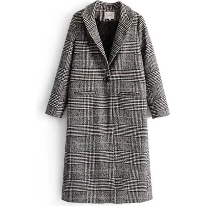 Longue Manteau En Laine Carreaux Manches Longues Mode Femme Blouson Gris Manteaux Hauts