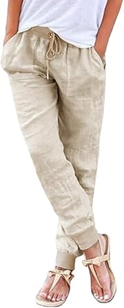 Femme Decontractee Coton Lin Ample Pantalon Leger Cordon Elastique Solide Couleur Pantacourt Sport Pants Vetements Femme