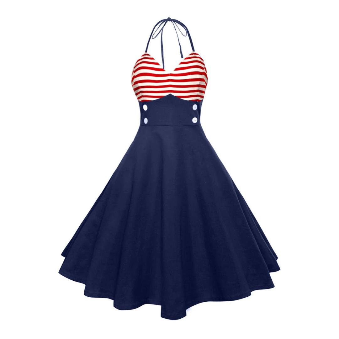 Day8 Robe Femme Chic Soiree Robe Femme Ete 18 Grande Taille Rayures Robe Vintage Annees 50 Pin Up Audrey Hepburn Pour Mariage Cocktail Style Halter Avec Bouton Jupe Robe Mode Printemps Soiree Vetements