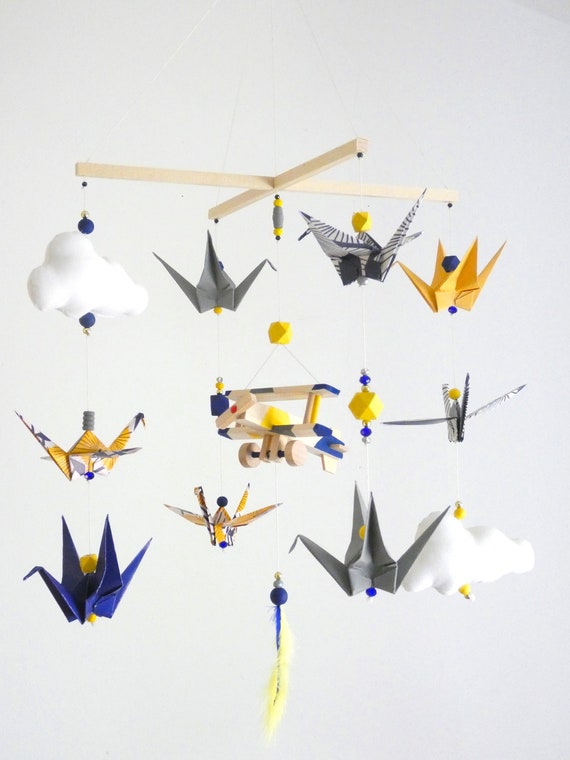 Mobile Bebe Origami Avion Bois Jaune Moutarde Bleu Canard Et Etsy Origami Baby Mobile Bebe