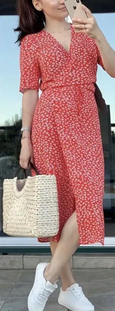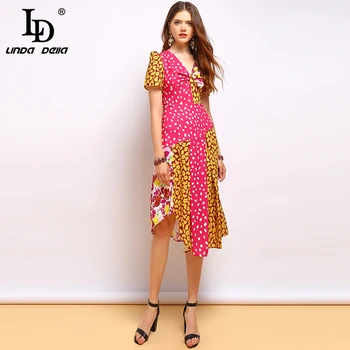Ld Linda Della Mode Ete Robe Vintage Femmes Sexy Col En V Volants Imprime Fleuri Elegant Vacances Asymetrie Robes Leather Bag