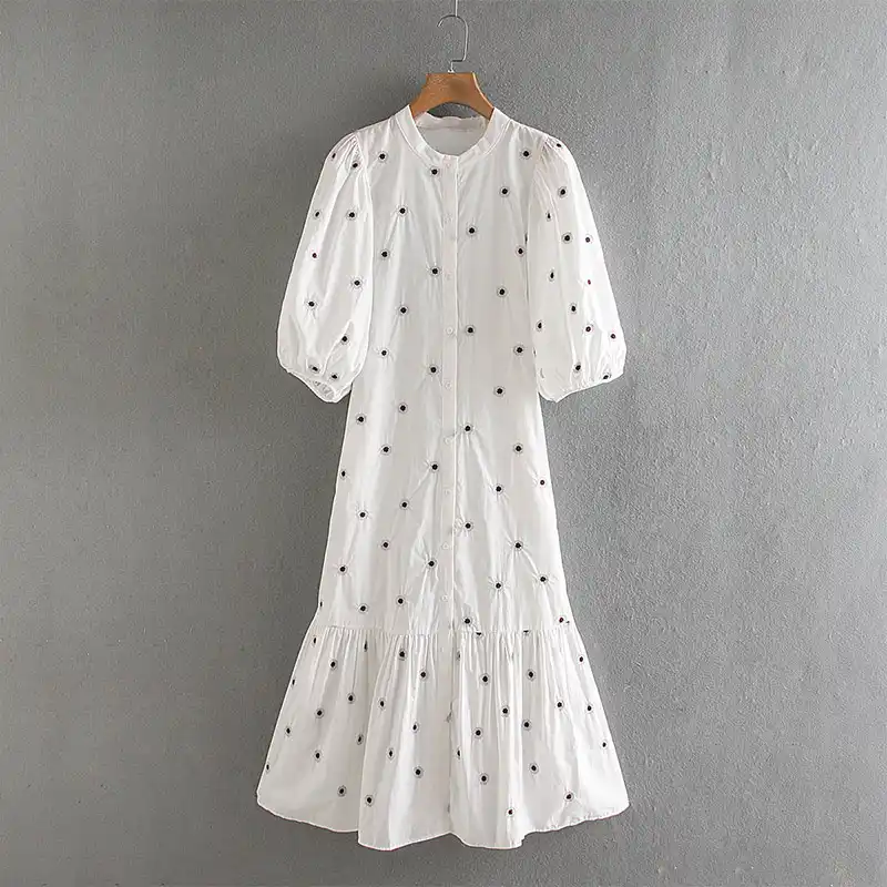 Femmes Folk Broderie Bouton Manches Bouffantes Robe Vintage Point Ample Robes Mi Longues Femmes Ete Blanc Doux Vestidos Vetements Aliexpress