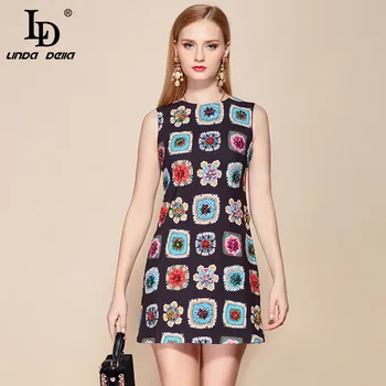 Ld Linda Della Nouveau Mode Piste Robe D Ete Femmes Sans Manches Magnifique Cristal Perles Impression Mini Mince Robe Vintage Leather Bag