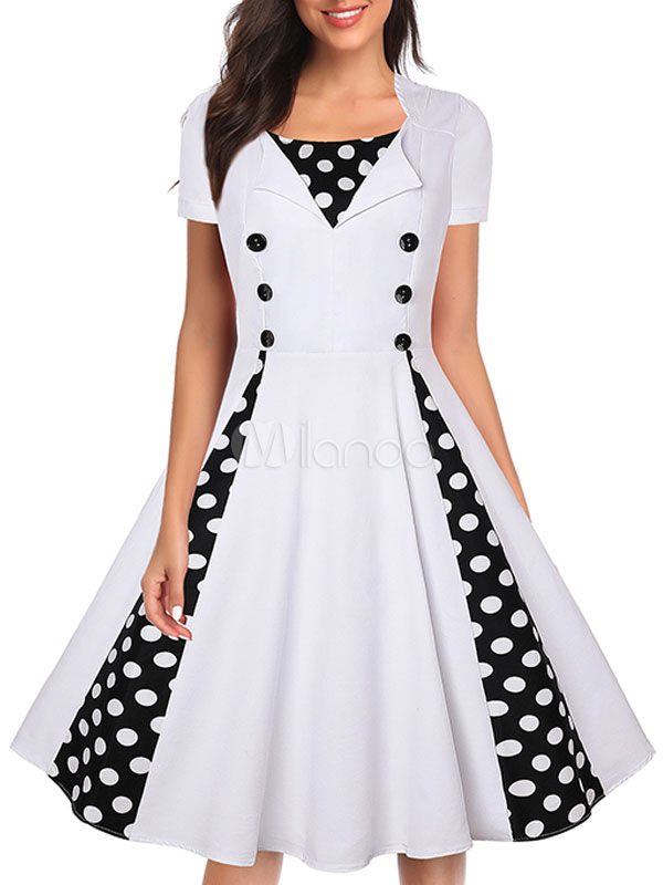 Robe Vintage Femmes Robe Annee 50 Imprime Manche Courte Noir Blanc Longueur Genou Robe Retro Avec Ceinture Milanoo Com