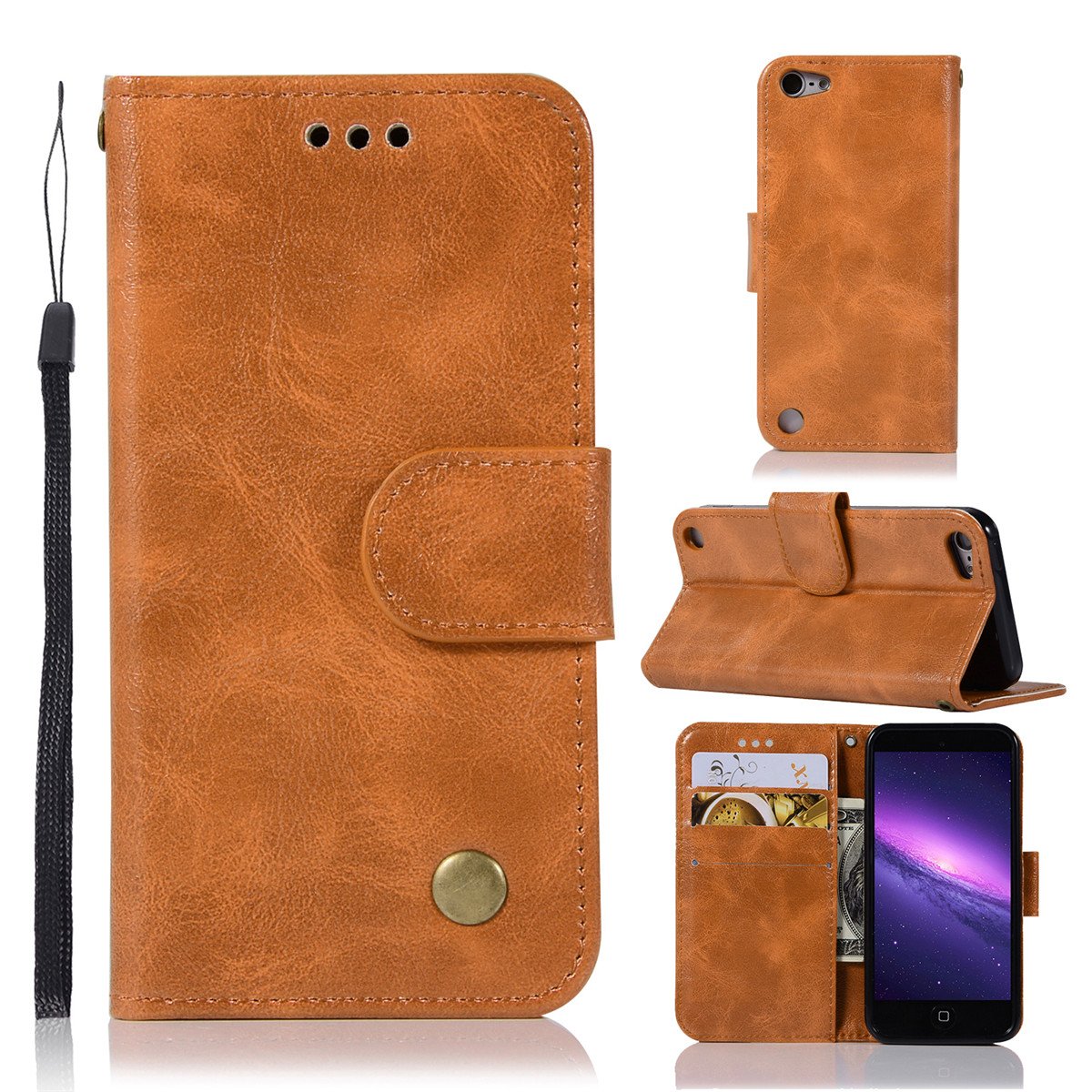 Accessoires Scheam Livre Flip Coque Etui Portefeuille Premium Pu Housse En Cuir Etui De Protection Pour Ipod Touch 5 6 Grey Marron Marron Support Pour Slot Pour Cartes Bequille Feature Etui Ipod