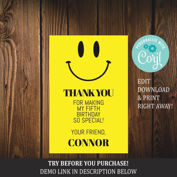 Smiley Face Birthday Thank You Card Happy Face Birthday Etsy