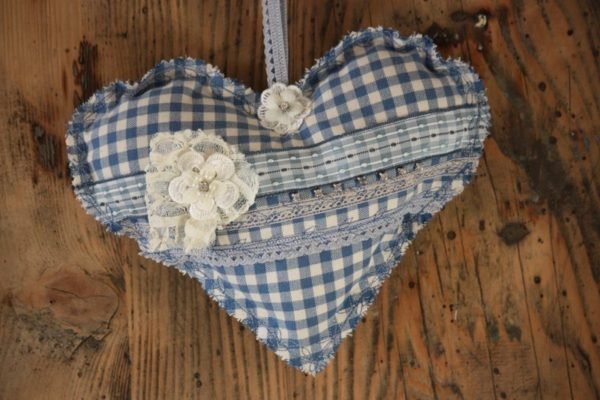 Coeur En Tissu Mon Coeur Vichy Bleu Et Blanc De Fleurs Et De Perles Boiseline