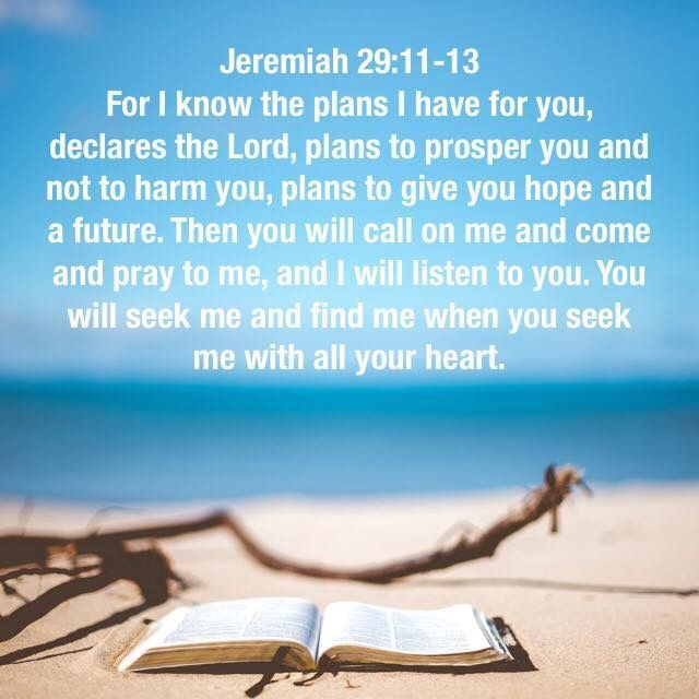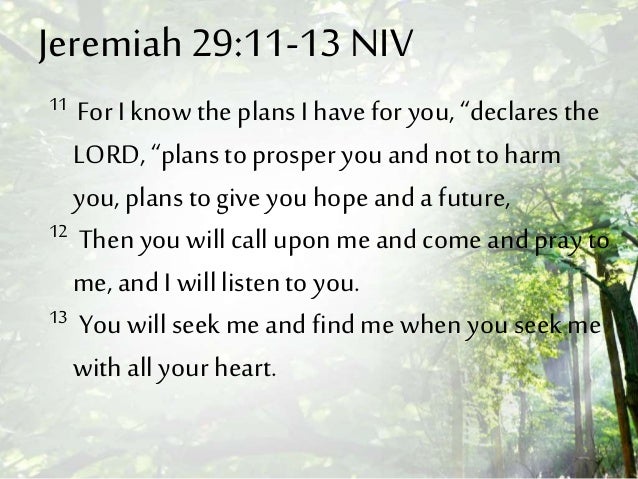 See on that passage Thereafter in. See on that passage Thereafter in. Jeremiah New International Version (NIV) 11 For I know the plans I have for you,” declares the Lord , “plans to prosper you and not to harm you, plans to give you hope and a future 12 Then you will call on me and come and pray to me, and I will listen to you 13 You will seek me and find me when you seek me with all your heart.