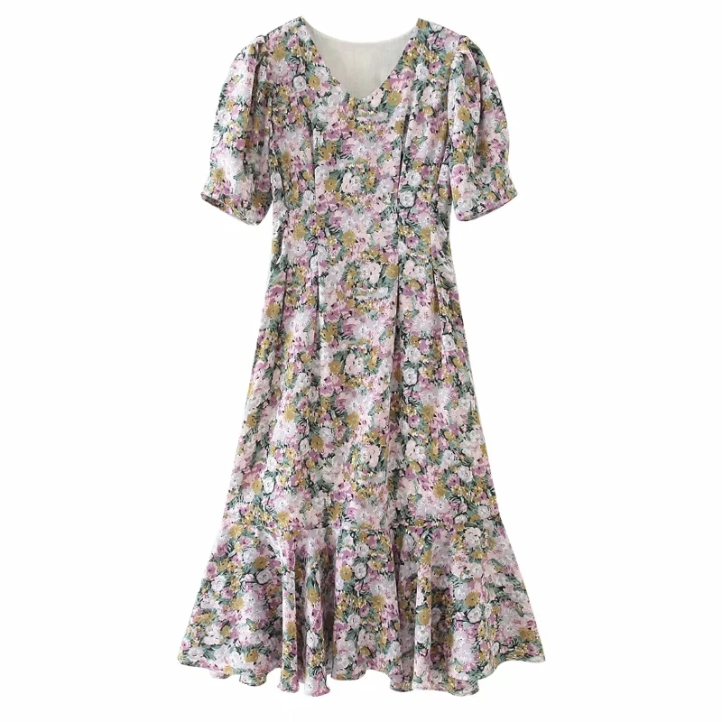 Vintage Imprime Fleuri Col En V Manches Bouffantes Robe Midi Femmes Ete Elegant Femme Robes Minces Femme Vetements Aliexpress