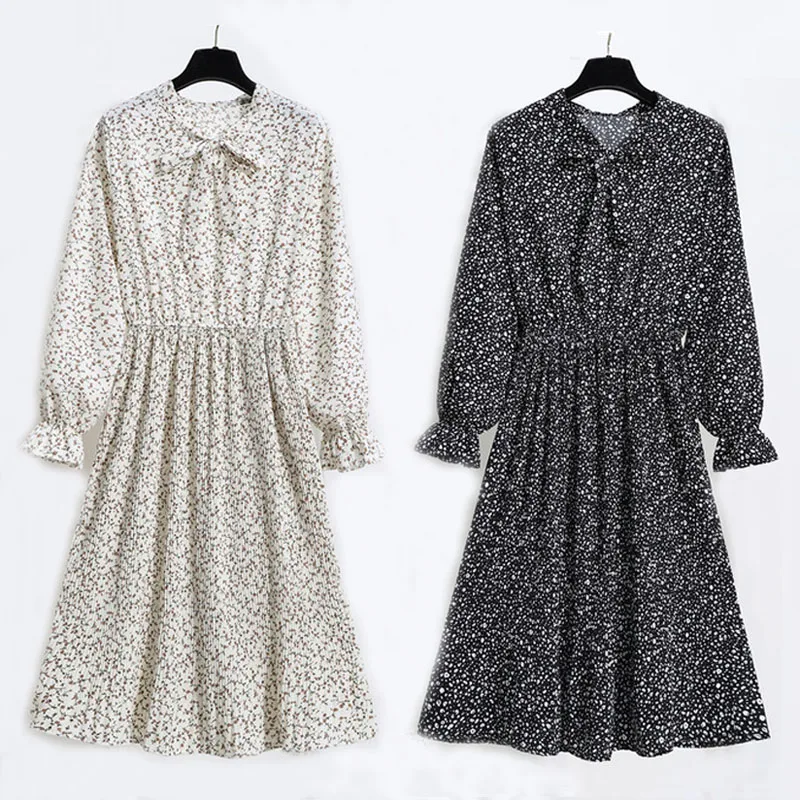 Imprime Fleuri Pli A Manches Longues Robe Noir Rose Printemps Nouveau Coreen Noeud Col Mince En Mousseline De Soie Robe Midi Fete Decontracte Une Ligne Vestido Aliexpress