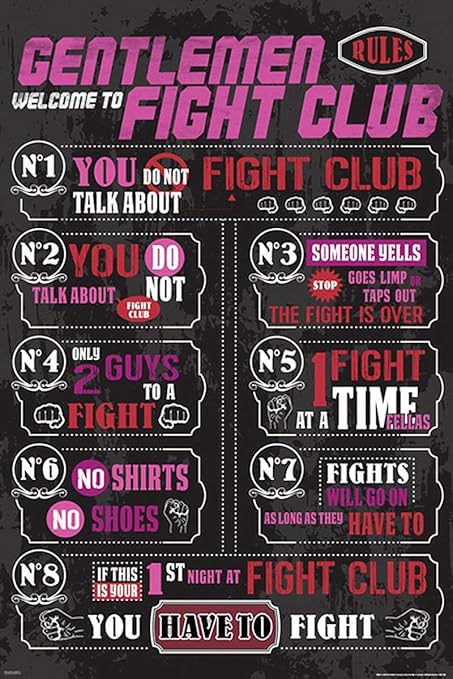 Règle 1 vous pouvez parler du Fight Club, plus nous serons, plus nous progresserons règle 2 on ne boxe au Fight Club que dans l'esprit convivial du Club, donc sur cooptation ou avis des profs règle 3 ne blessez pas votre partenaire, contrôlezvous en toutes circonstances, et tentez de suivre le rythme proposé règle 4 les oppositions toniques ne se réalisent qu'avec les. Poster Fight Club Règles du Fight Club Super poster avec les règles (en anglais) du Fight Club pour tous les fans 1 You do not talk about the Fight Club 2 You are the Fightclub and you do not talk about the Fight Club 3 Someone yells stop goes limp or taps out 4 Only 2 guys to a fight 5 1 fight at a time 6 No shirts no shoes 7 Fights go on as long as they have to 8. Facile il est interdit de parler du Fight Club.