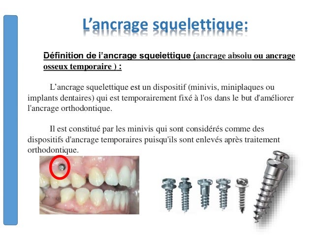 Le système d’ancrage osseux orthodontique (Orthodontic Bone Anchor (OBA) System) est destiné. La présente invention concerne un ancrage orthodontique The present invention discloses an anchor (50) for orthodontics L'implant peut comporter un ancrage périnéal, et un ancrage d'obturateur ou un ancrage rétropubien The implant can include a perineal anchor, and an obturator anchor or retropubic anchor Les chevilles d' ancrage possèdent plusieurs zones fonctionnelles. Le traitement orthodontique sera dès lors plus conservateur, sans extraction et pouvant même parfois éviter les traitements chirurgicoorthodontiques Après quelques rappels sur les principes de biomécanique appliqués aux déplacements dentaires nous décrirons les miniplaques d’ancrage.