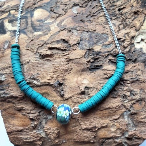 Création collier, Perles en verre fait main par un artisan verrier, pierres naturelles, cristal, acier inoxydable, zamac plaqué argent, câble gainé caoutchouc Hypoallergénique Pour toutes demandes particulières ou modification contactezmoi. Magnifique perle de verre façonnée à la main dans le feu au sein de mon atelier, montée sur un collier en Argent 925 La transparence du verre permet de refléter la lumière avec de jolies nuances plus ou moins claires A porter en toute saison et toute occasion!. C'est le Best de cet été !Le collier de surfeur fait son grand retour, à porter sur le sable ou bien en ville, succombez à cet indispensable du dressing Pour cette réalisation il vous faut des rondelles Heishiun sachet de 8grammes permet de réaliser environ cm des rondelles en métal 2 perles à écraser un fermoi.