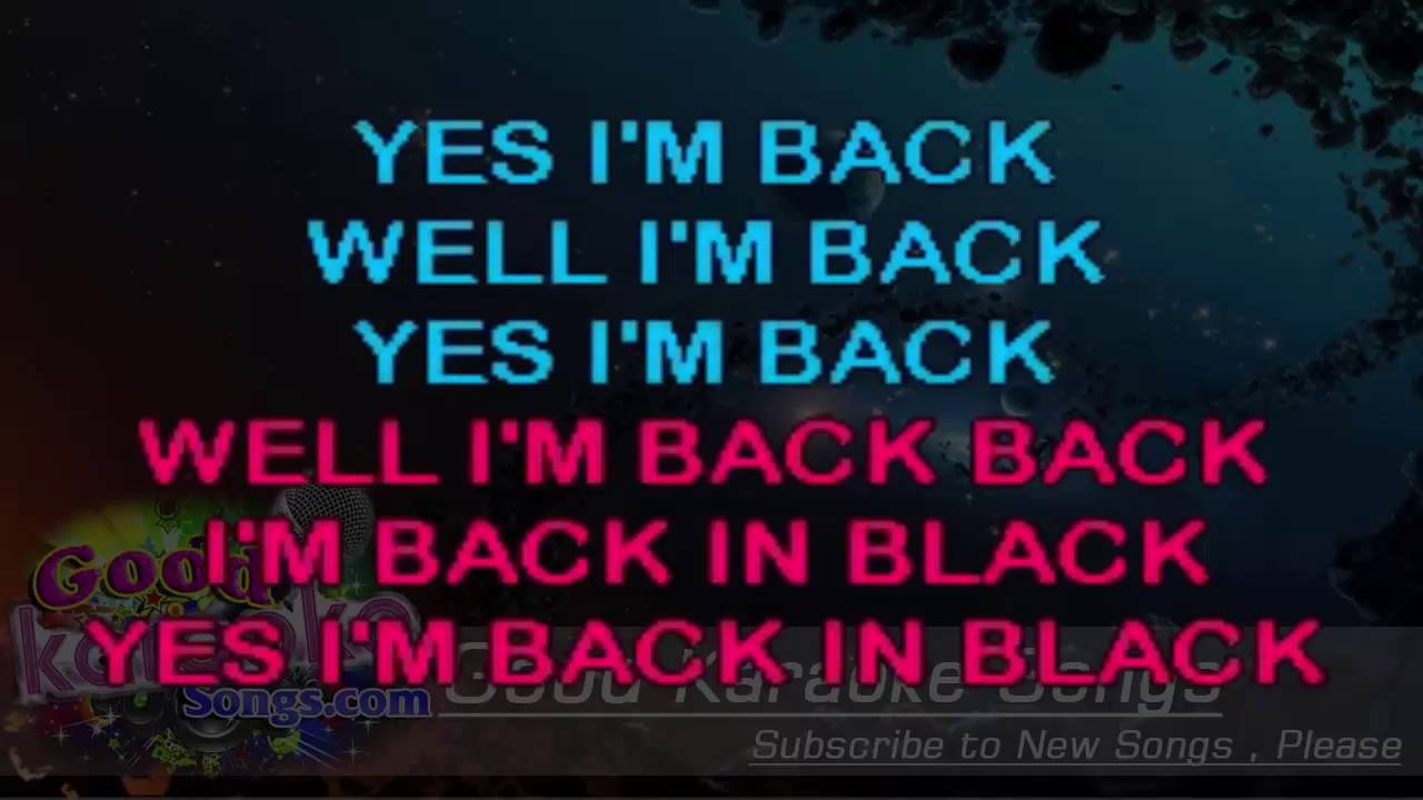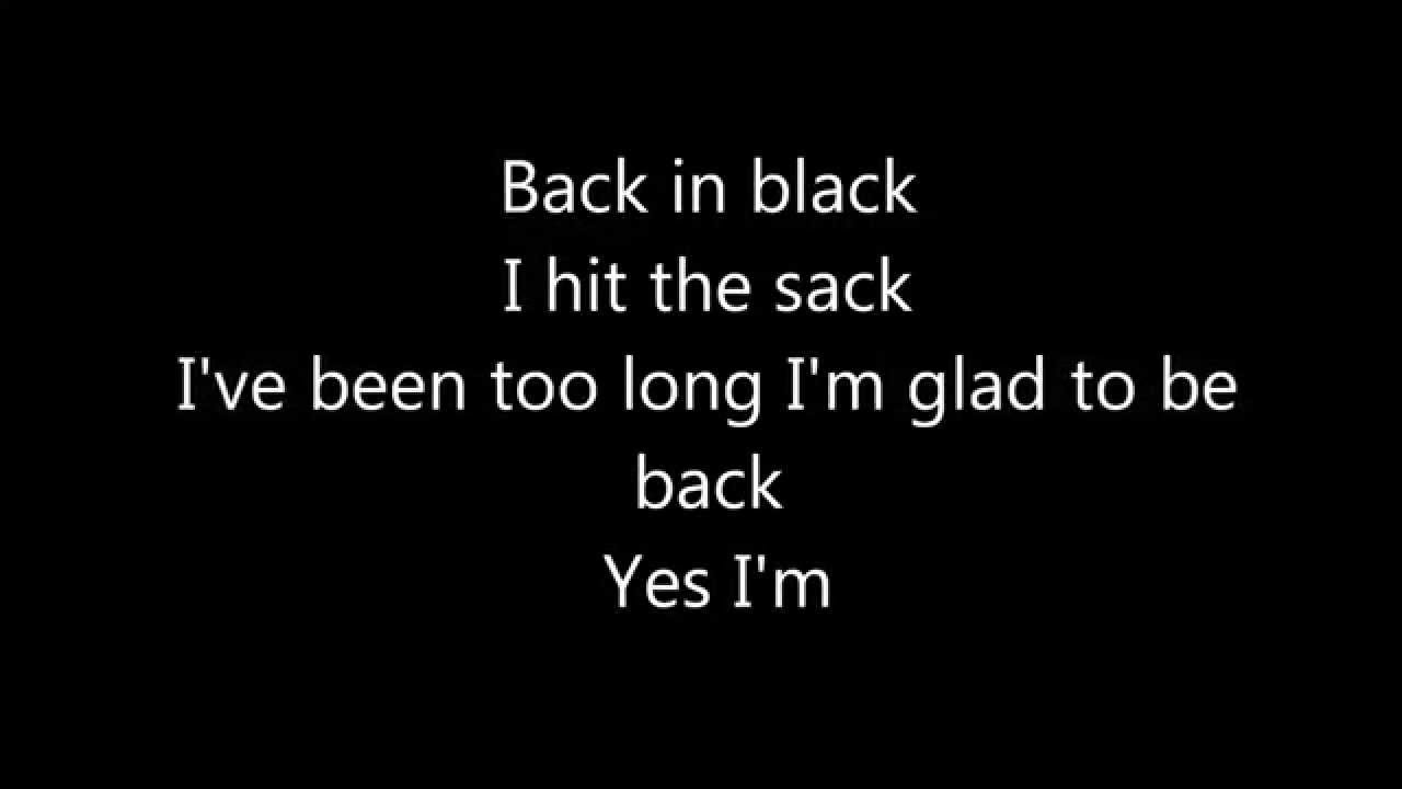 Yeahcheck it out Back in, back in back in back in back in black Cause I'm back, Yes I'm back. AC DC Back In Black lyrics & video Back in black, I hit the sack, I've been too long, I'm glad to be back, Yes I'm let loose, From the noose, That's kept me hanging about I'. Yes I'm back well I'm back Yes I'm back Well I'm back back Well I'm back in black Yes I'm back in black Back in the back of a Cadillac Number one with a bullet I'm a power pack Yes I am In a bang with the gang They gotta catch me if they want me to hang Cause I'm back on the track and I'm beatin' the flack Nobody's gonna get me on another rap.