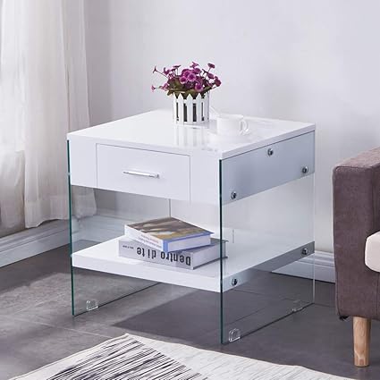 Goldfan Moderne Haute Brillance Petite Table Basse Salon Verre Table D Appoint Chevet Carre Rangement Bout De Canape Avec Tiroir Pour Chambre Design Scandinave Blanc Amazon Fr Cuisine Maison