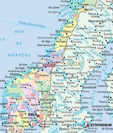 Cercle polaire carte norvege. Nous voyons sur la carte que le cercle polaire est au niveau de Mo i Rana, à 130 km environ d’ici, soit à 8 heures de route, timing norvégien, mouararfarfarf Mais non, cette mauvaise langue La route est droite, file entre les plaines, avec peu de virages, nous traversons des steppes de sapins, puis des espaces plus rases avec une. Carte de l'Arctique avec le cercle arctique en tirets bleus Le cercle arctique marque la limite sud du jour polaire lors du solstice de juin et de la nuit polaire lors du solstice de décembre Audelà du cercle arctique, le Soleil reste audessus de l'horizon pendant au moins vingtquatre heures consécutives au moins une fois dans l'année. Cercle polaire arctique, Saltstraumen, Bodo, retour vers le Frrroid Publié par Estelle Rhoo le 31 mai 19 31 mai 19 De Lovund, on quitte la route 17 pour rentrer dans les terres, traverser le cercle polaire arctique, voir le maelström « Saltstraumen » et aller à Bodo prendre le ferry vers les îles Lofoten.