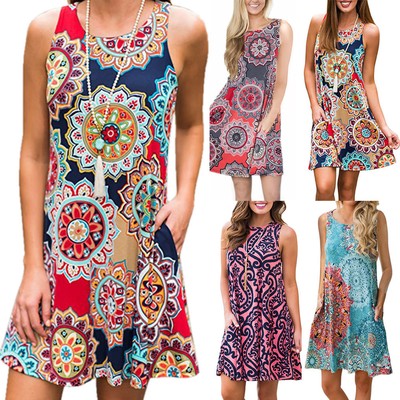 Boheme Femmes Robe D Ete Tunique Vintage Imprimer D Ete Sans Manches Plage Robe Ebay