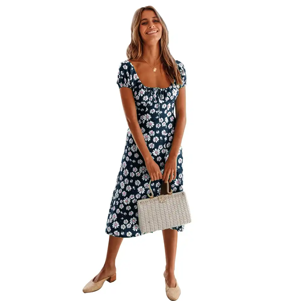 Robe D Ete Mi Longue Pour Femmes Avec Col Carre Et Manches Courtes Imprimee Avec Fente Robe De Plage Aliexpress