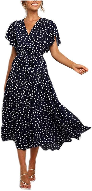 Laiyuting Robe D Ete Mi Longue En Mousseline De Soie Col En V A Pois Manches Courtes Amazon Fr Vetements Et Accessoires