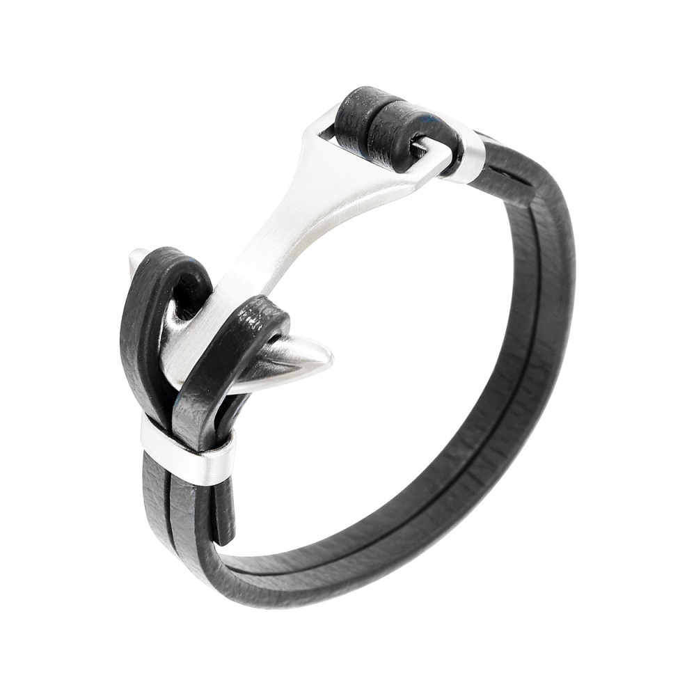 Bracelet Homme Ancre Marine Acier 316l Et Cuir Noir