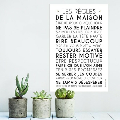 Poster mural pour salon, cuisine et chambre d'enfant Richesse de motifs affiche noir et blanc, affiche colorée, poster New York, affiche citation, poster nature, poster jungle avec ou sans cadre Un riche choix de posters XXL pas chers Découvrez une collection de posters et affiches déco sur mesure chez bimago. Design contemporain pour cette sélection / Impression haute qualité / 100% Made In France Soldes jusqu'à 60%, profitezen!. Affiche à encadrer Les règles de notre maison Je vous propose cette jolie affiche, à mettre sous cadre (CADRE NON INCLUS)C'est un joli cadeau à offrirLe format est a4 L'affiche est imprimée en haute définition sur du papier photo 240grL'envoi est sous enveloppe cartonnéeMERCI DE VÉRIFIER QUE VOTRE BOITE AUX LETTRES EST NORMALISÉE ET QUE DONC UNE ENVELOPPE PEUT Y ETRE INSÉRÉE.