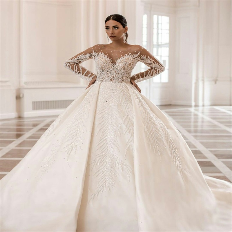 Luxe Robe De Mariage Bal Princesse A Line Avec Manche Longue Transparente Blanche Longue Col Rond Tulle Dentelle Applique Plus Blanc Achat Vente Robe De Mariee Soldes Sur Cdiscount Des