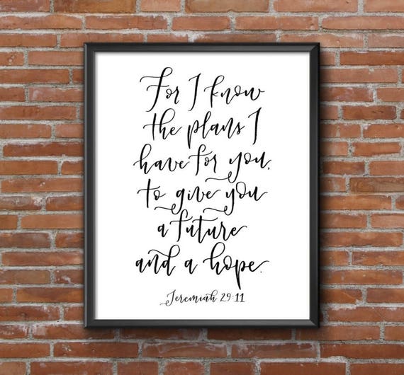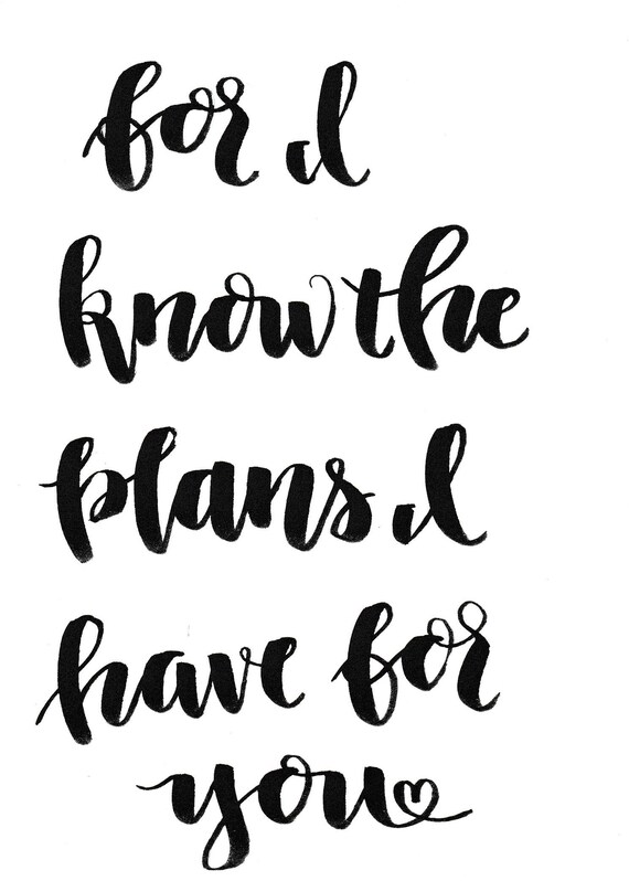 Aug 28, 16 For I know the plans I have for you declares the Lord Plans to prosper and not to harm you Plans to give you hope and a future Jeremiah 2911 ~~PRODUCT DESCRIPTION~~ * Removable vinyl wall decal *Colors can be selected from the color palette found in listing pictures * Any sample photo used is. KAT's Calligraphy Subtitle Home;. Jeremiah 2911 5x7 Print // hand lettering // calligraphy // Etsy CHRISTMAS SHIPPING DEADLINES Nov Last day for international shipping Dec 10 Last day for domestic shipping Handlettered 5x7 Black & White Printed on watercolor paper Reads for I know the plans I have for you, declares the LORD, plans for welfare and not.