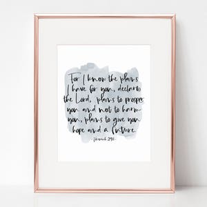 Web Store My Cart 0 items All Products / Jeremiah 2911for children Jeremiah 2911for children $350 "For I know the plans I have for you, declares the Lord, plans to prosper you and not harm you, plans to give you hope and a future". For I Know The Plans I Have For You Print Jeremiah 2911 Rose Gold This handlettered calligraphy print of the passage from Jeremiah 2911 would make a lovely addition to the home The ontrend geometric design features rose gold and gold glitter effect and watercolour flowers in dusky pink and blue tones. Handlettered 5x7 Black & White Printed on watercolor paper Reads for I know the plans I have for you, declares the LORD, plans for welfare and not for evil, to give you a future and a hope Jeremiah 2911 *FRAME/STAND NOT INCLUDED* Add a print stand to display your favorite prints.