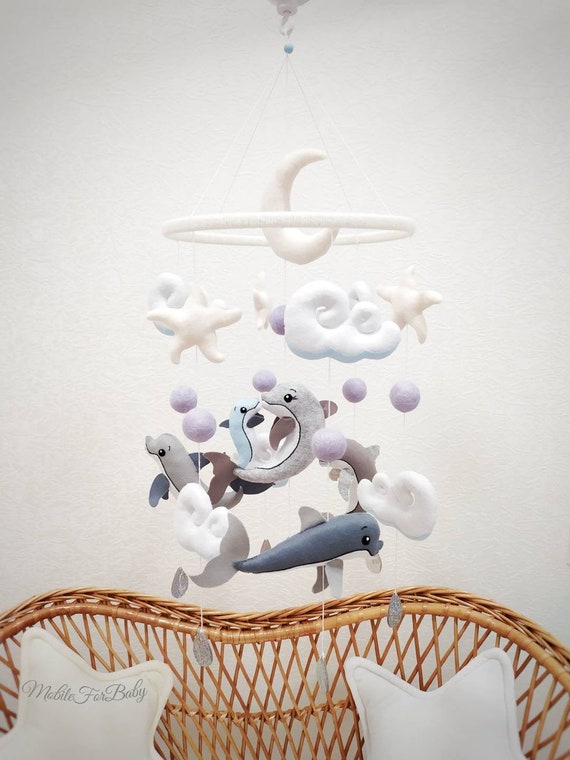 Baby Mobile Boy Felt Mobile Crib Grey Dolphins Blue Sea Ocean Etsy