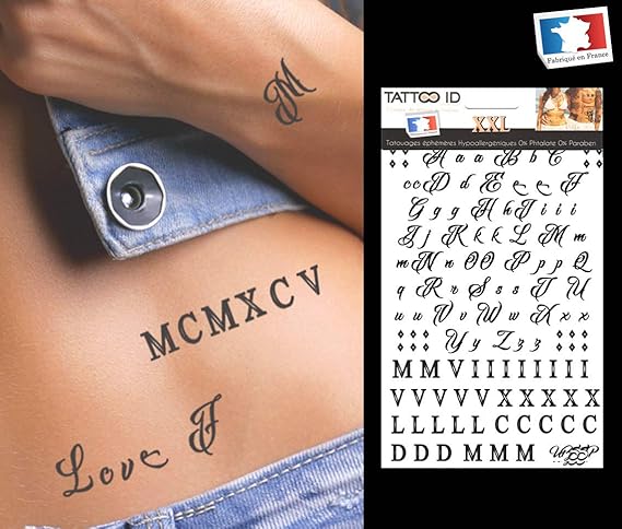 Tatouage Ephemere Temporaire Lettres Et Chiffres Romains Tattoo Id Xxl Hypoallergenique Fabrique En France 1 Planches 22 Cm X 14 5 Cm Homme Femme Amazon Fr Beaute Et Parfum