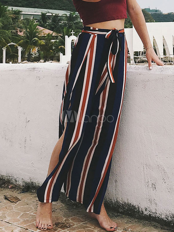 Femmes Pantalons D Ete Raye Bleu Profond Split Pantalon Large Milanoo Com
