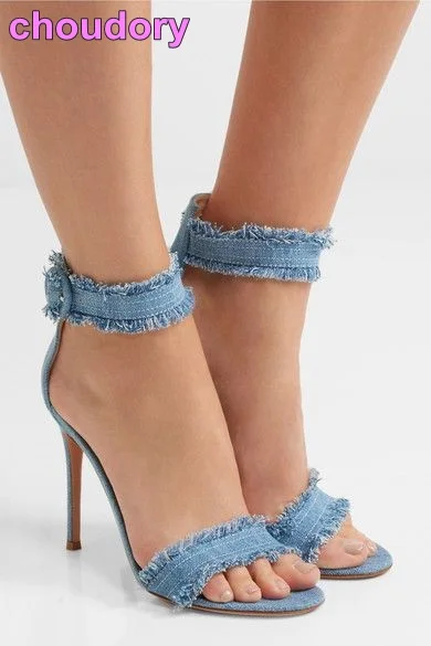 Sandales En Jean Bleu Pour Femmes Chaussures En Denim A Talon Haut Et Fines A Bout Ouvert Chaussures Retro Avec Boucle A La Cheville Aliexpress