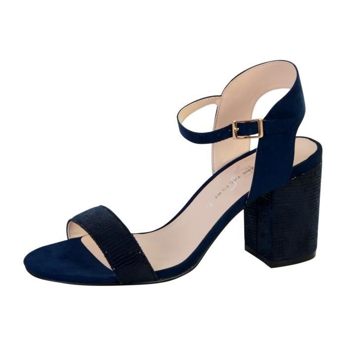 Sandales semelles amovibles Dessus cuir avec effets de matières mates et reflets brillants argentés Doublure cuir, première cuir sur mousse, amovible pour y placer ses propres semelles orthopédiques Elastique d'aisance côtés et milieu devant Semelle élastomère antidérapante Talon argenté 5 cm env. Les nupieds et sandales bleues femme incontournables !. Sandales bleu marine en suédine à talon carré et épais Bride ajustable à la cheville.