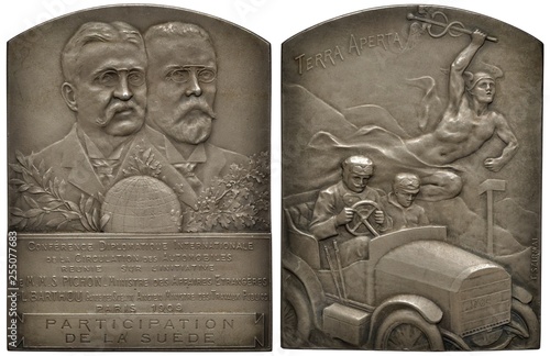 France French Commemorative Silver Plaque 1909 Subject International Conference On Car Traffic Two Conjoined Busts Behind Globe Text Below Two Men In Car Flying Mercury With Caduceus Above Buy This Stock