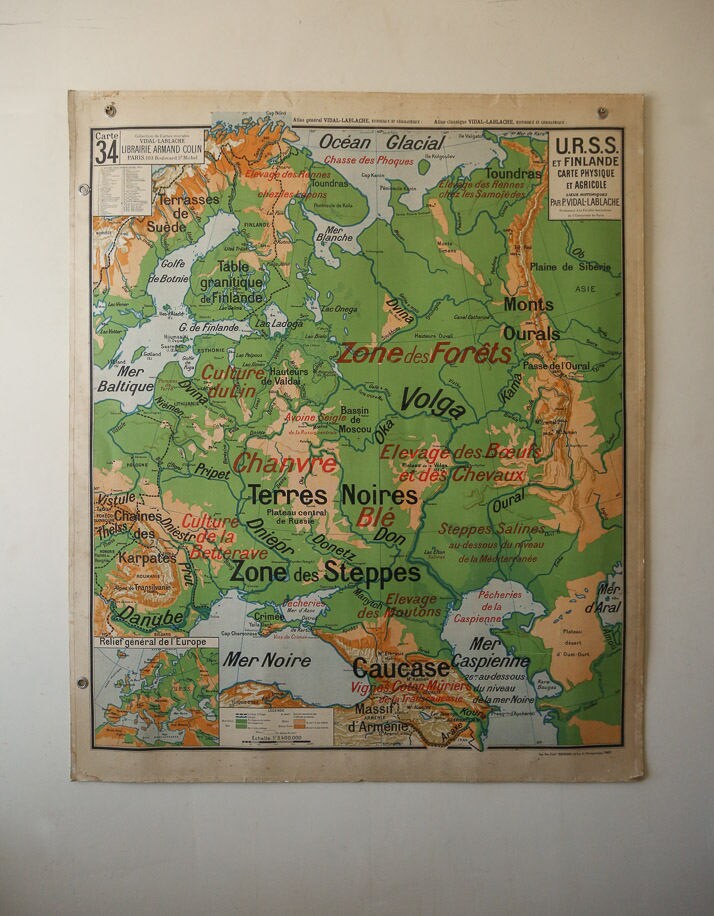 Original 1950s Large Vintage French Educational School Wall Chart Ussr Finland Map Quirky Beautiful Rare Vidal Lablache