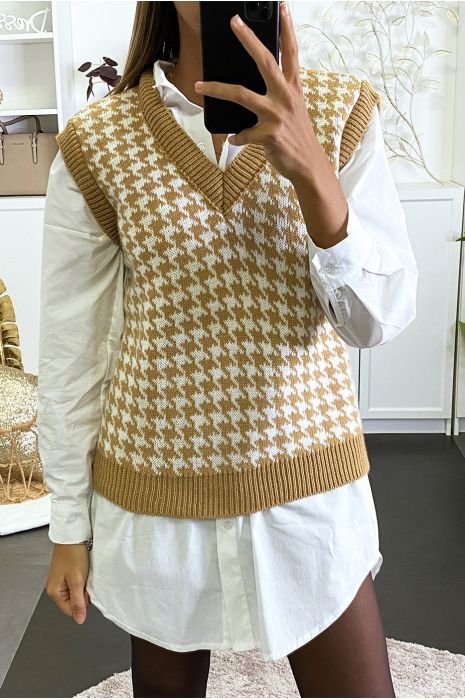 Camel Sleeveless Knit Sweater With Houndstooth Patterns