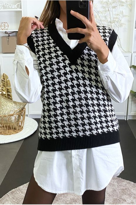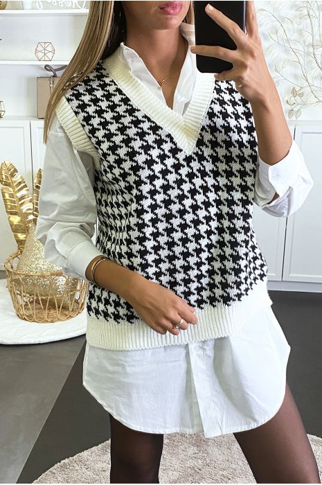 White Sleeveless Knit Sweater With Houndstooth Patterns