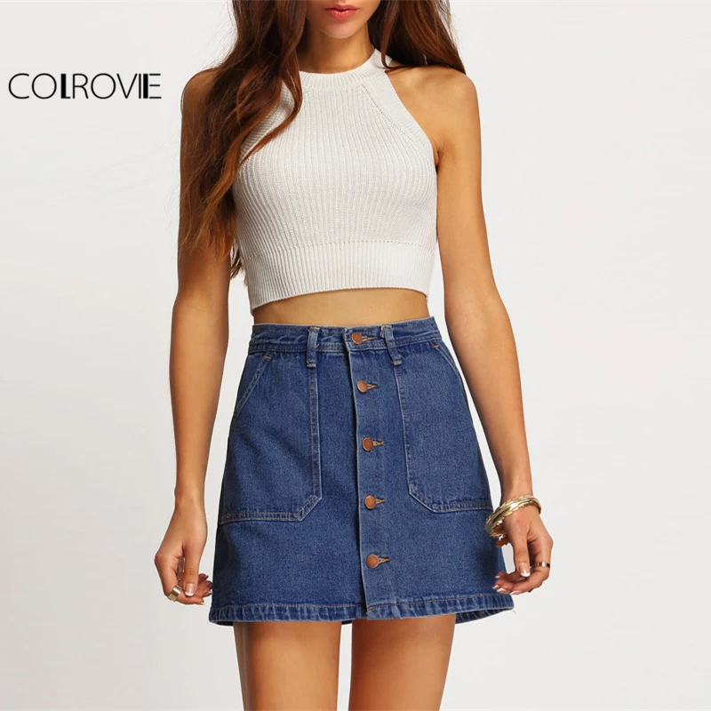 Colrovie Bleu Trapeze Boutonnee Jupe En Jean Taille Moyenne Au Dessus Du Genou Jupe Avec Poche Femme Decontracte Jupe Courte Aliexpress
