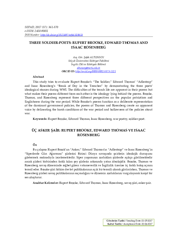Pdf Three Soldier Poets Rupert Brooke Edward Thomas And Isaac Rosenberg Safak Altunsoy Phd Academia Edu