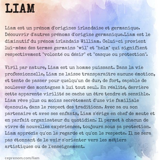 Découvrez vite la signification du prénom liam sur le site La Boîte Rose Signification le peuple pour moi (hébreu). Héros de la saga "Taken", l'acteur Liam Neeson a largement contribué à la popularité du prénom Liam dans son pays d'origine (l'Irlande) et sur la scène internationale Il est aidé dans sa mission par d'autres Liam célèbres comme le musicien Liam Gallagher (groupe Oasis) ou le chanteur du groupe One Direction, Liam Payne. Liam est un prénom, diminutif de l'irlandais Uilliam, équivalent de Guillaume Le prénom Liam est apparu en France en 1986, et depuis, ne cesse d'augmenter année après annéeEn Suisse, c'est le prénom masculin le plus attribué aux nouveaunés en 18 1 On fête les Liam avec les William le 10 janvier comme Guillaume de Bourges 2 ou le 15 mars comme William Hart 3.
