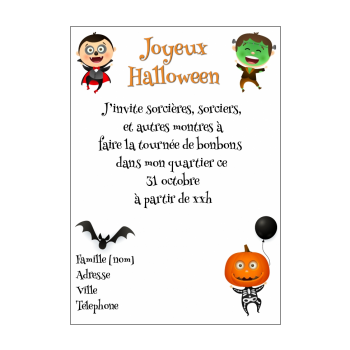 Carte d'invitation à imprimer Choisissez la ou les cartes de votre choix et téléchargez les Vous pourrez par la suite les imprimer gratuitement, il ne reste que votre texte et signature à ajouter Pour lire et imprimer les cartes vous aurez besoin du logiciel Acrobat Reader que vous pouvez télécharger gratuitement ici. Cartes d'invitation Halloween gratuites à imprimer sur papier cartonné Cartes d'invitation à une fête Halloween pour les enfants Voici de très bons moyens de prévenir tous vos amis que vous organisez une fête Halloween, 6 jolies cartes d’invitation gratuites à imprimer sur du papier cartonné ou sur du papier photo qui font très professionnelles et qui les motiveront pour venir. Carte D’invitation Halloween Imprimer – Avezvous frémir de peur lorsque vous essayez de penser à des messages d’Halloween à écrire dans vos cartes de voeux d’Halloween?.