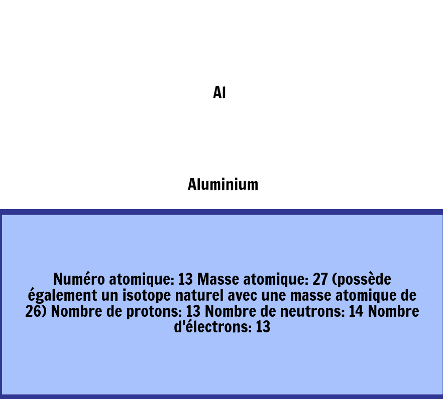 L'aluminium est l'élément chimique de numéro atomique 13, de symbole Al Il appartient au groupe 13 du tableau périodique ainsi qu'à la famille des métaux pauvres Le corps simple aluminium est un métal malléable, de couleur argent, remarquable pour sa résistance à l’oxydation et sa faible densité. TABLEAU PÉRIODIQUE DES ÉLÉMENTS La référence en matière de recherche européenne OAFRP Li 3 6,941 Lithium 0,534 g/cm 3 H 1 1, Hydrogène 0,0 g/L (0 °C). Il y a cependant certains éléments connus comme l’Oxygène, l’Or, l’Aluminium, le Chlore, l’Hélium, l’Azote, le Néon D’autres éléments renvoient à de célèbres scientifiques comme le Curium (Pierre et Marie Curie), le Nobélium (Alfred Nobel), le Mendélévium (Dmitri Mendeleïev créateur du tableau périodique).