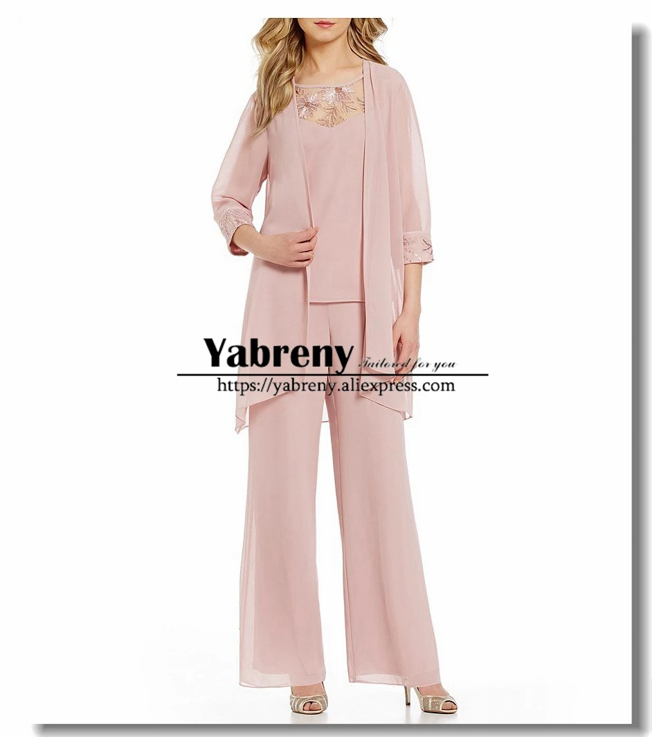 Perle Rose Mousseline De Soie 3 Pieces Tenue Mere De La Mariee Pantalon Costume Avec Veste Aliexpress