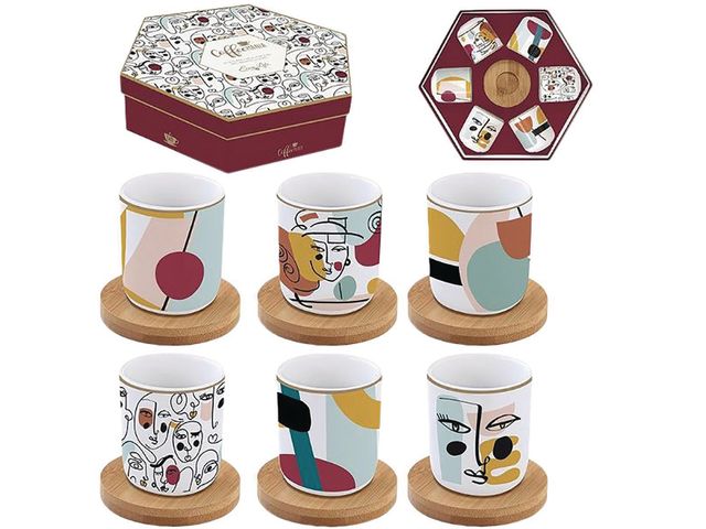 Coffret De 6 Tasses A Cafe Design Geometrique Avec Soucoupe En Bambou