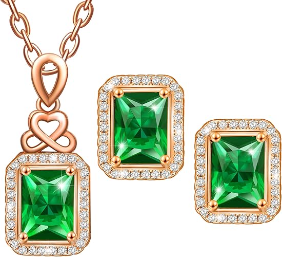Marenja Parure Bijoux Fantaisie Femme Collier Pendentif Rectangle Vert Emeraude Avec Chaine Et Boucles D Oreilles Clous Bijoux Cristal En Plaque Or Rose Amazon Fr Bijoux