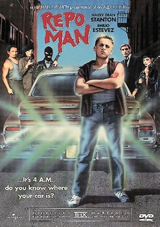 Keep your eyes peeled for the air fresheners, the generic newspaper box, and the watches without hands. A vaguely surreal modernnoir sciencefiction comedy with echoes of Kiss Me Deadly (1955), Repo Man is packed with more incongruous sight gags than anyone can absorb in one viewing;. Repo Man A quintessential cult film of the 1980s, Alex Cox’s singular scifi comedy stars the always captivating Harry Dean Stanton as a weathered repo man in a desolate Los Angeles, and Emilio Estevez as the nihilistic middleclass punk he takes under his wing.